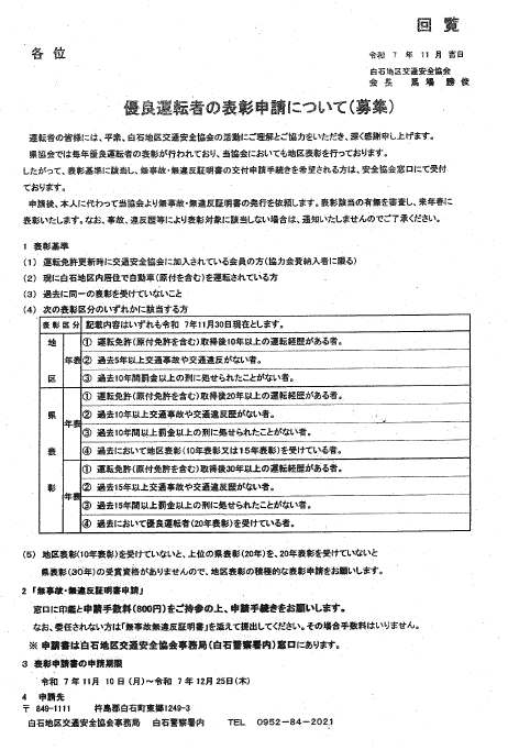 ⇒優良運転者の表彰申請についてのPDFデータはこちら (PDFファイル; 86KB)