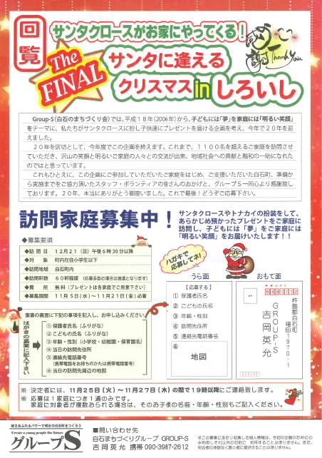 ⇒サンタに逢えるクリスマス㏌しろいしについてのPDFデータはこちら (PDFファイル; 404KB)