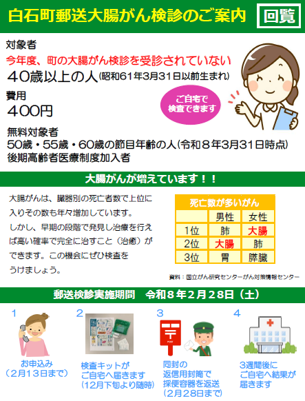 ⇒白石町郵送大腸がん検診についてのPDFデータはこちら (PDFファイル; 916KB)