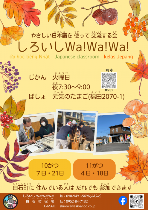 白石町では、日本人と外国人がやさしい日本語で交流する場として、2017(平成29)年度に日本語教室「しろいしWa!Wa!Wa!」が立ち上がりました。この教室では日本人と話したり、JLPT(日本語能力試験)の合格に向けた勉強をしたりと、様々な過ごし方で日本語を学習されています。