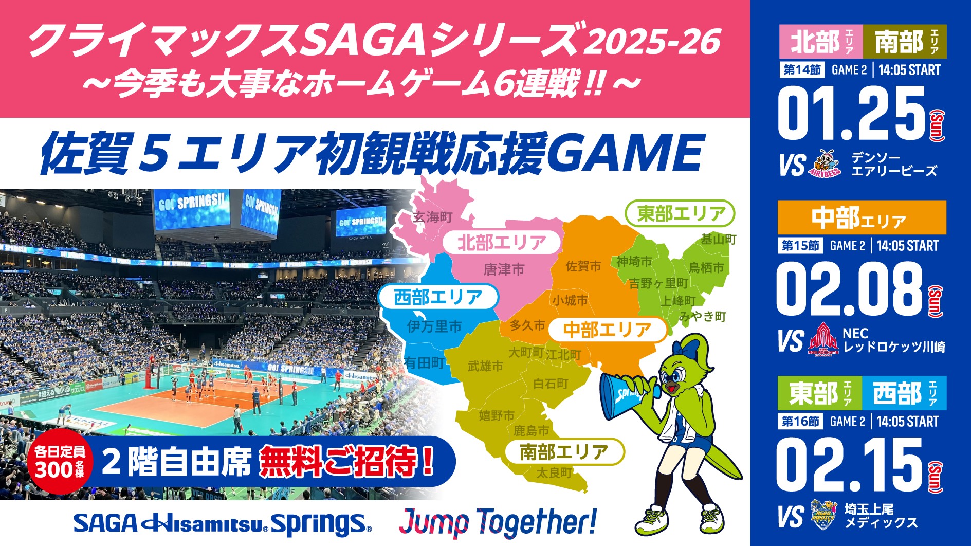 白石町は南部エリアとなりますので、1月25日(日)の試合に先着300名が招待されます。