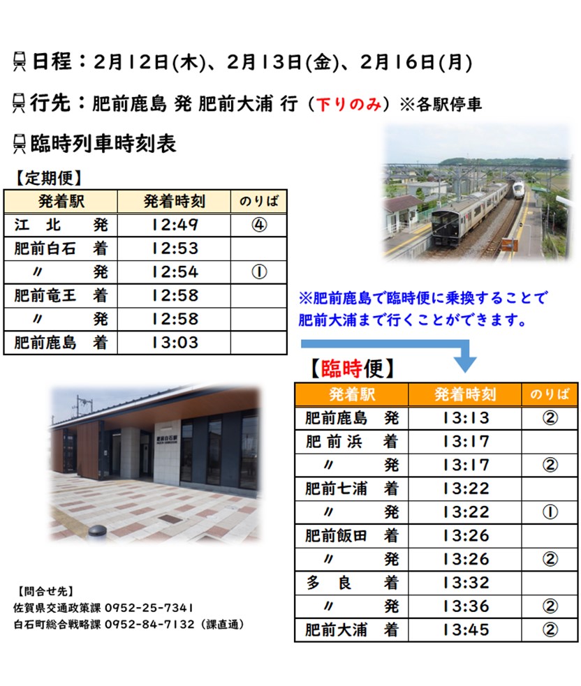 佐賀県とJR長崎本線沿線市町では、高校生の学年末考査の期間に合わせて臨時列車を運行します。(発車時刻は現時点の予定です)