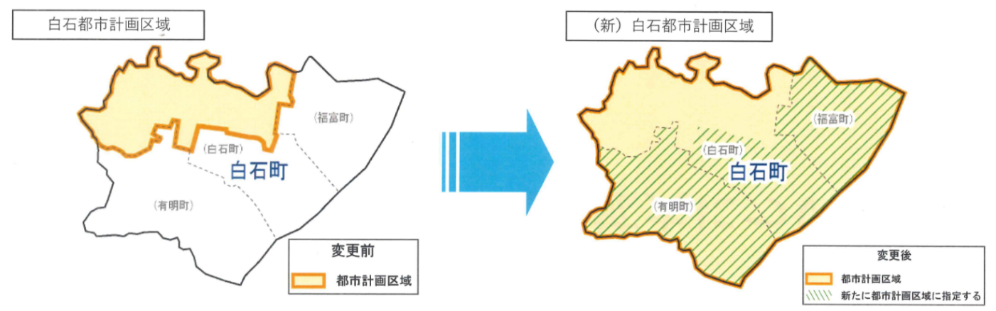 本町においては、昭和31年7月に旧白石町の北明地域を除いた地域が白石都市計画区域として指定され、市町村合併後の平成21年度に白石町都市計画マスタープランを制定し、その中で町全体が一体となったまちづくりを推進するために都市計画区域を町全体に拡大する方向性を決定しました。